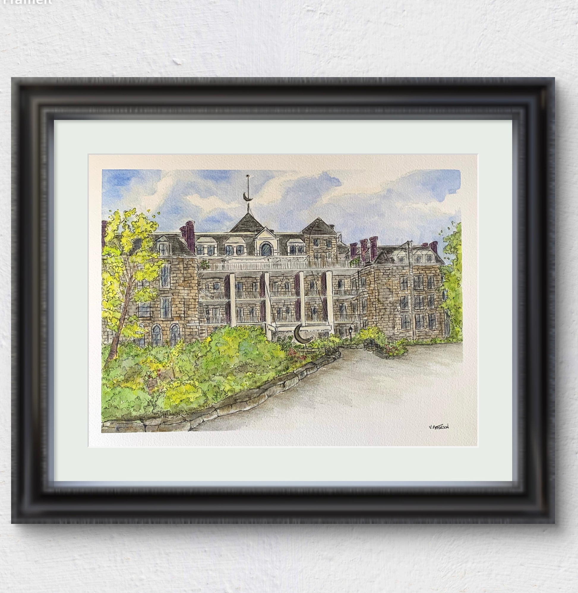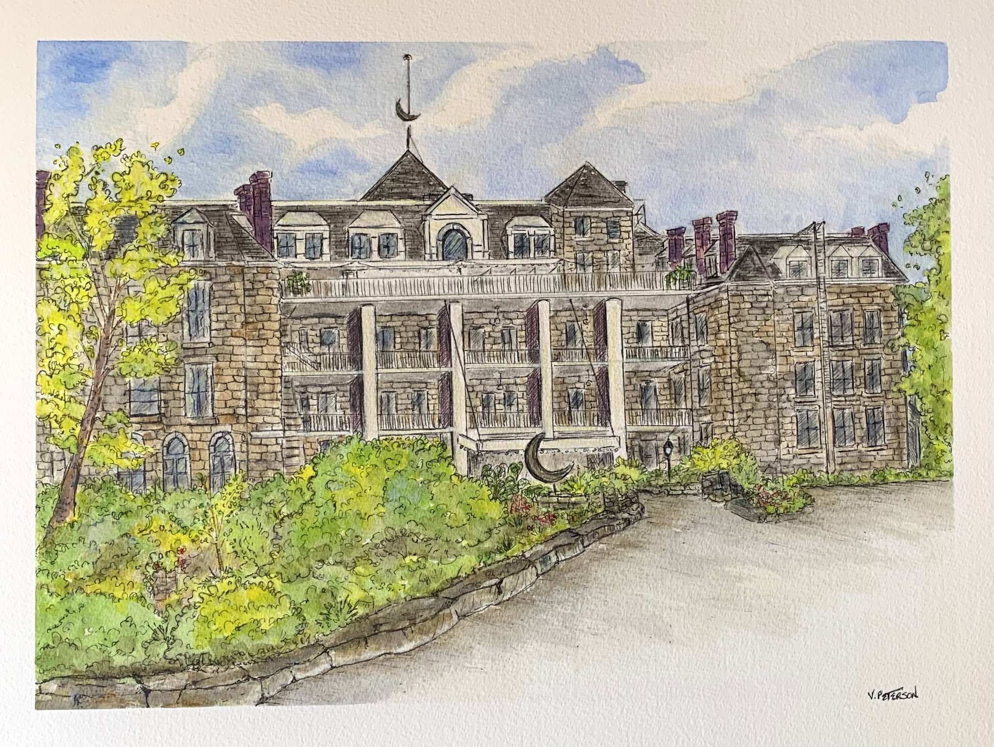 This original watercolor and ink painting depicts the historic 1886 Crescent Hotel in Eureka Springs, Arkansas. Rendered with loose line work and layered washes, the piece captures the character and presence of the landmark while allowing light and atmosphere to guide the details. The surrounding greenery and stone architecture reflect the balance between nature and structure that defines the setting.