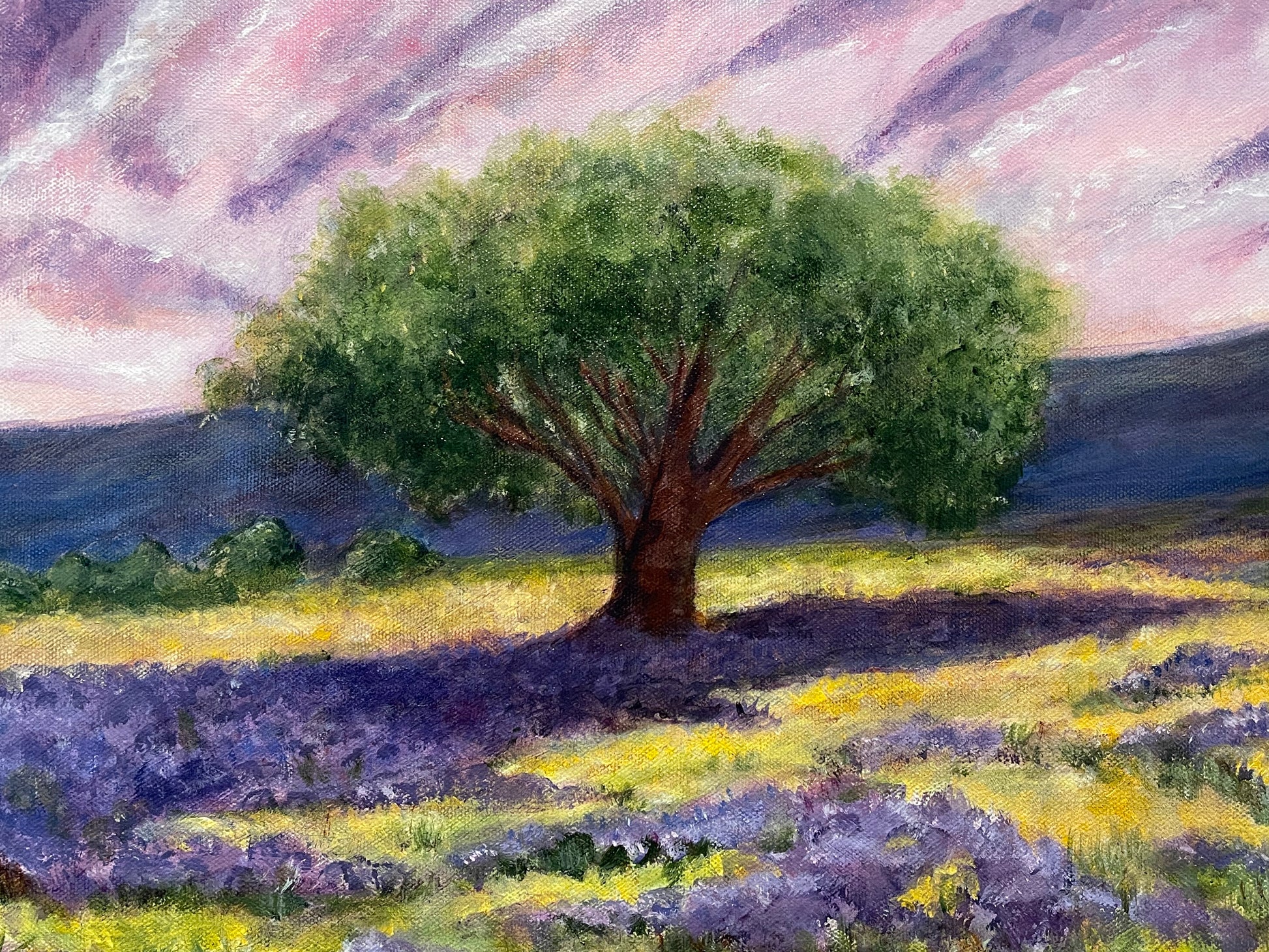 Consider the Wildflowers (24 × 30, acrylic on canvas) is loosely inspired by the landscapes of Mt. Gilboa. Layers of violet and gold wildflowers stretch toward a quiet horizon, anchored by a solitary tree beneath a luminous sky. The painting reflects on God’s provision and the beauty of creation...an invitation to rest, trust, and notice the care woven into the natural world.