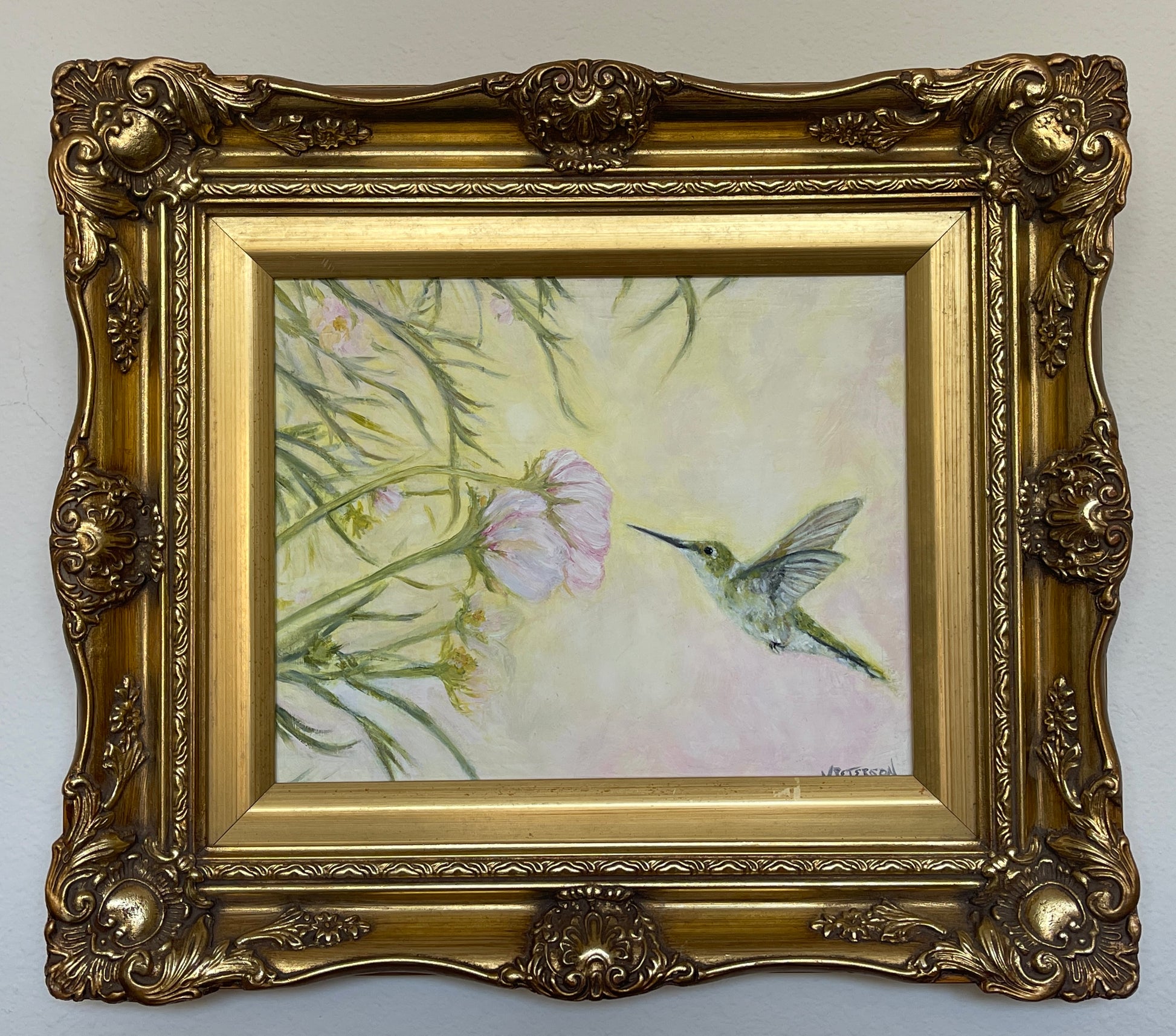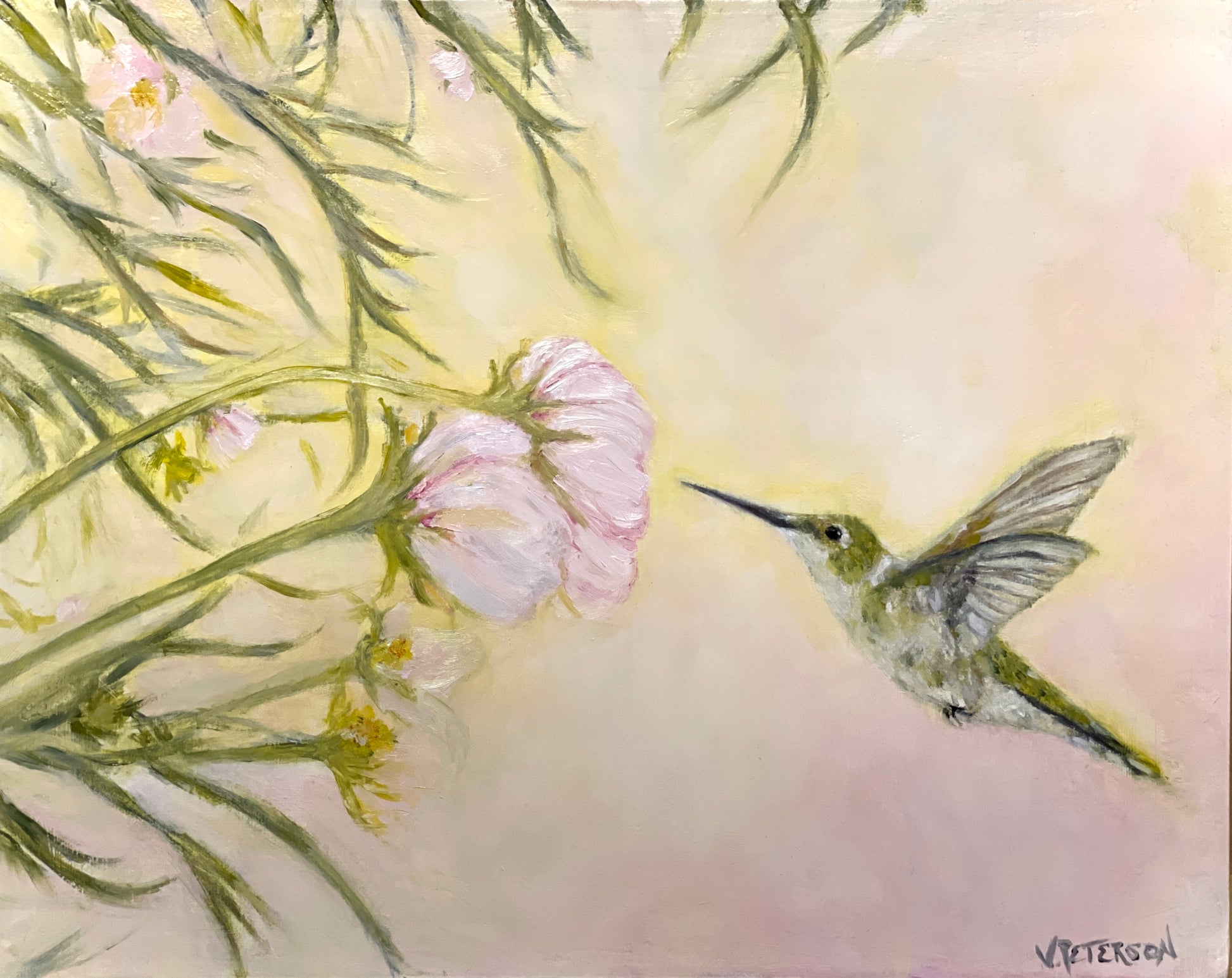 Lemonade Springs captures a quiet moment of pause… a hummingbird suspended in air, drawn toward a pale bloom in soft, luminous light. Painted in oil on linen, the surface holds gentle texture and warmth, allowing the brushwork to remain subtle and atmospheric.