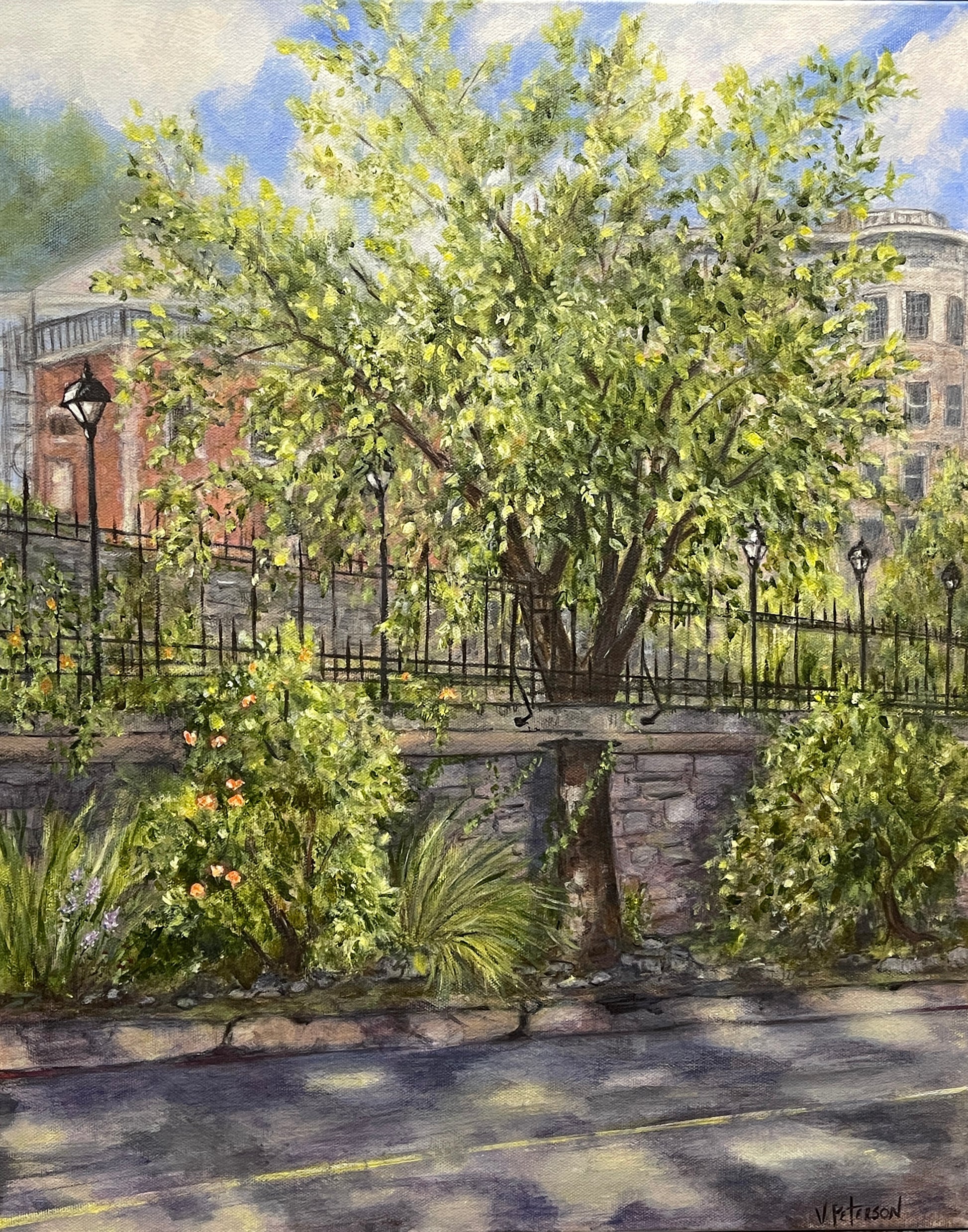 Painted in downtown Eureka Springs, Arkansas, Room to Grow features a tree preserved between Spring Street and Main Street, where the sidewalk was intentionally built around it rather than removing it. This piece reflects the quiet coexistence of nature and structure, capturing filtered light, layered greens, and the calm presence of growth within an urban setting.